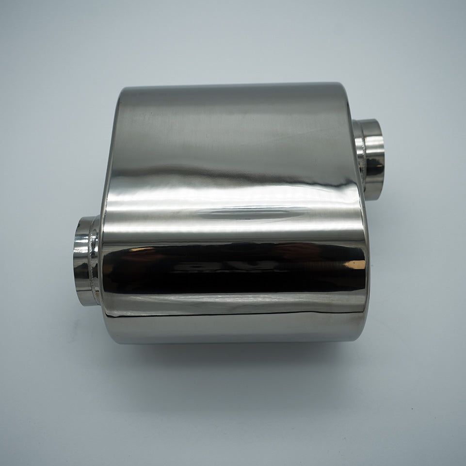 Offset In - Offset Out Straight through design muffler / resonator made from 316 stainless steel. 2.5" in and out.